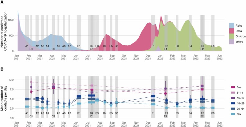 Figure 1. COVID-19 epidemic and social contact survey in Switzerland. A: Reported number of hospitalized COVID-19 cases reported by the FOPH colored by the proportion of variants sequenced. Gray bars and digits represent each CoMix survey wave. B: Mean number and 95% confidence interval of social contacts by age group and wave. Figure from Reichmuth et al., 2024.